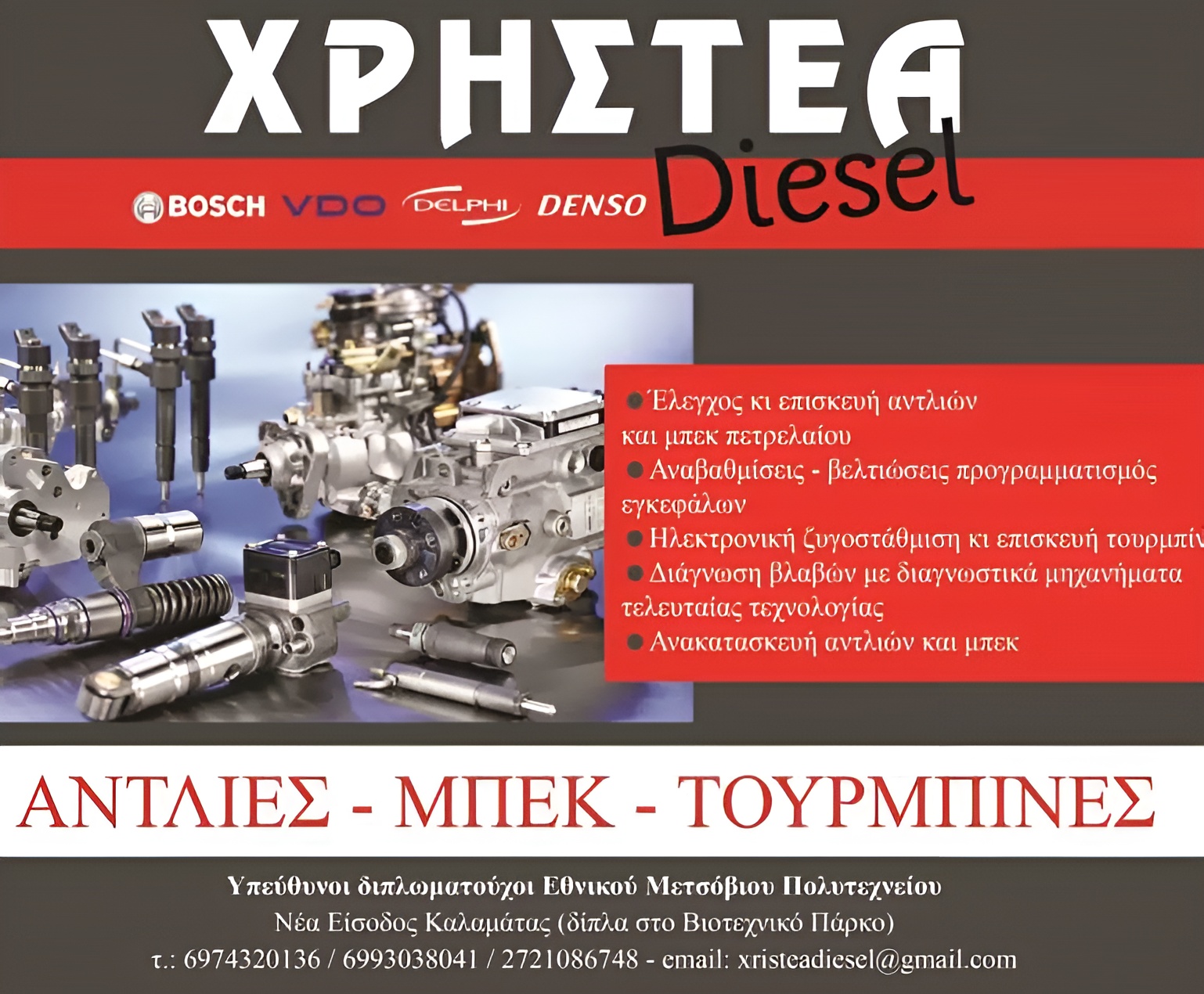Η επιχείρηση ΧΡΗΣΤΕΑ DIESEL SERVICE ιδρύθηκε το 1984 και εδρεύει στην Καλαμάτα, προσφέροντας ολοκληρωμένες υπηρεσίες για αντλίες, μπεκ και τουρμπίνες πετρελαίου. Με πολυετή εμπειρία και συνεχή ενημέρωση στις τεχνολογίες του diesel, το συνεργείο διαθέτει πλήρως εξοπλισμένο δοκιμαστήριο αντλιών και σύγχρονα διαγνωστικά μηχανήματα, ικανά να εντοπίζουν και να αποκαθιστούν κάθε βλάβη σε κινητήρες πετρελαίου — από μηχανικά έως ηλεκτρονικά συστήματα.