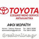 Το συνεργείο «Αφοί Μωραΐτη», λειτουργεί σαν εξειδικευμένο service TOYOTA για περισσότερο από 30 χρόνια στην Κέρκυρα παρέχοντας αξιόπιστες υπηρεσίες ελέγχου και επισκευής αυτοκινήτων και γνήσια ή 1ης εφαρμογής ανταλλακτικά TOYOTA. Στο συνεργείο αυτοκινήτων «Αφοί Μωραΐτη» έχουν τη δυνατότητα να καλύπτουν όλα τα μηχανικά και ηλεκτρονικά προβλήματα του αυτοκινήτου σας άμεσα και αποτελεσματικά βασισμένοι στην εμπειρία και το εξουσιοδοτημένο προσωπικό. Με σύμμαχο τον σύγχρονο εξοπλισμό μας, την ποιότητα των ανταλλακτικών και των πρώτων υλών (λάδια από εργοστάσιο TOYOTA) και τα διαγνωστικά μηχανήματα τελευταίας γενιάς σας εξασφαλίζουν εγγυημένα αποτελέσματα σε πολύ προσιτές τιμές!