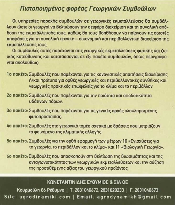 - Εξειδικευμένες γεωργικές συμβουλές φυτικής και ζωικής κατεύθυνσης.