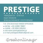 Συγκεκριμένα στο “PRESTIGE TEXTILES” μπορείτε να βρείτε καλύμματα και υφάσματα για: σαλόνια, καναπέδες, σκαμπό, κρεβάτια, πολυθρόνες, τραπεζαρίες, κουρτίνες, μαξιλάρες, χτιστά έπιπλα. Επίσης διαθέτει μεγάλη ποικιλία σε είδη κιγκαλερίας, κουρτινόξυλα, είδη σκίασης, ρόλερ, ρόμαν, καθώς και έπιπλα εξωτερικού χώρου….κ.α.