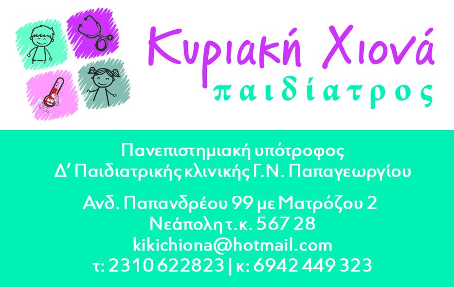 Η Χιονά Κυριακή είναι παιδίατρος με παιδιατρείο στη Νεάπολη Θεσσαλονίκης, προσφέροντας ολοκληρωμένη και υπεύθυνη ιατρική φροντίδα για βρέφη, παιδιά και εφήβους. Η άσκηση της παιδιατρικής βασίζεται στην επιστημονική γνώση, τη συνέπεια και τη συνεχή παρακολούθηση της υγείας και της ανάπτυξης των παιδιών, σε ένα περιβάλλον φιλικό και ασφαλές για όλη την οικογένεια.
