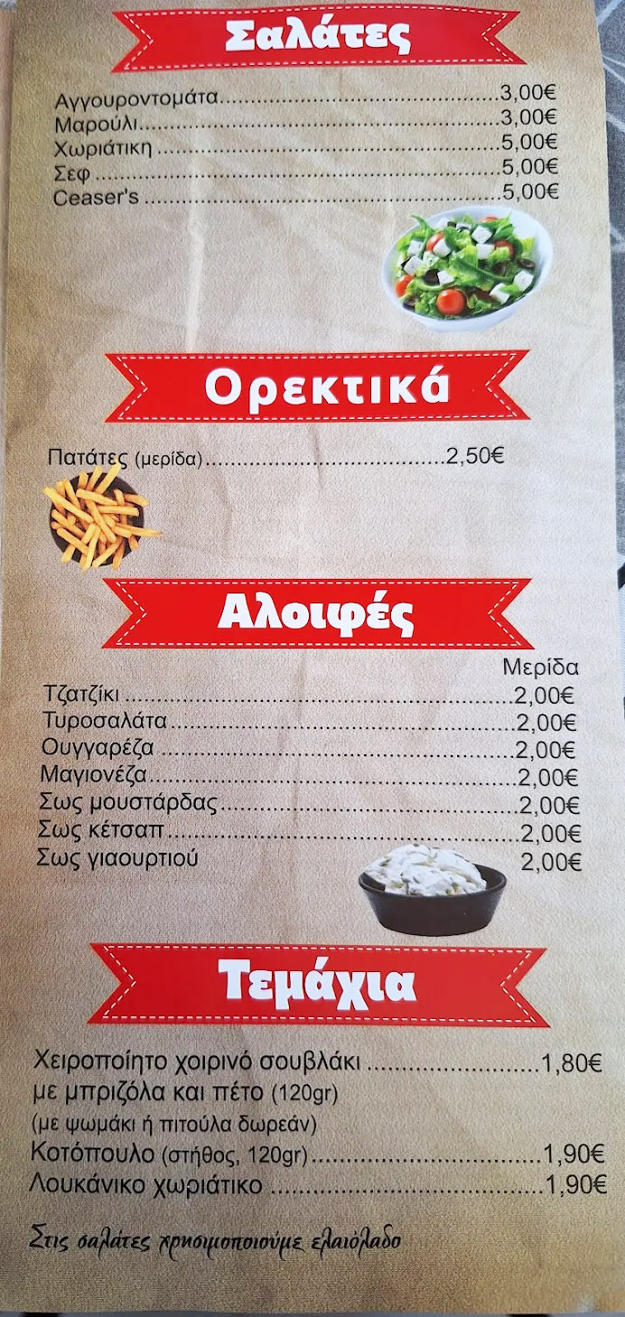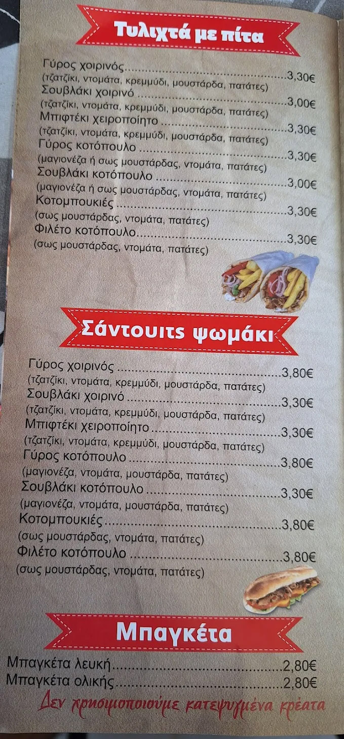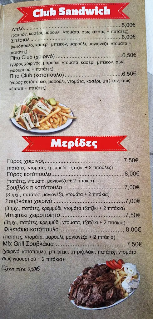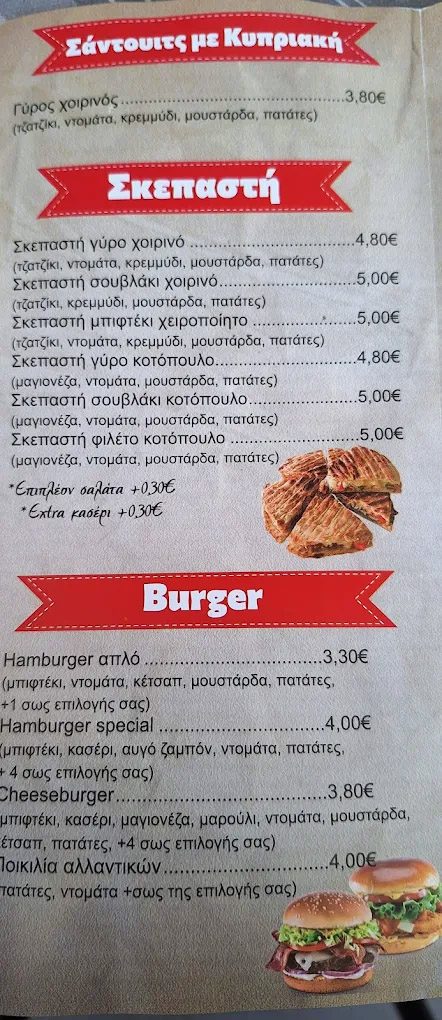 Το μενού περιλαμβάνει κλασικά ψητά της ώρας, γύρο, καλαμάκια και εκλεκτά κρεατικά όπως χοιρινό και κοτόπουλο, σε πολλές εκδοχές. Διατίθενται τυλιχτά με πίτα, σάντουιτς σε ψωμάκι ή μπαγκέτα, club sandwich, καθώς και ιδιαίτερες επιλογές όπως σάντουιτς με κυπριακή πίτα και σκεπαστές με γύρο, μπιφτέκι ή κοτόπουλο. Οι μερίδες είναι πλούσιες, ενώ τα burgers αποτελούν επίσης μια εξαιρετική επιλογή για τους λάτρεις του street food.