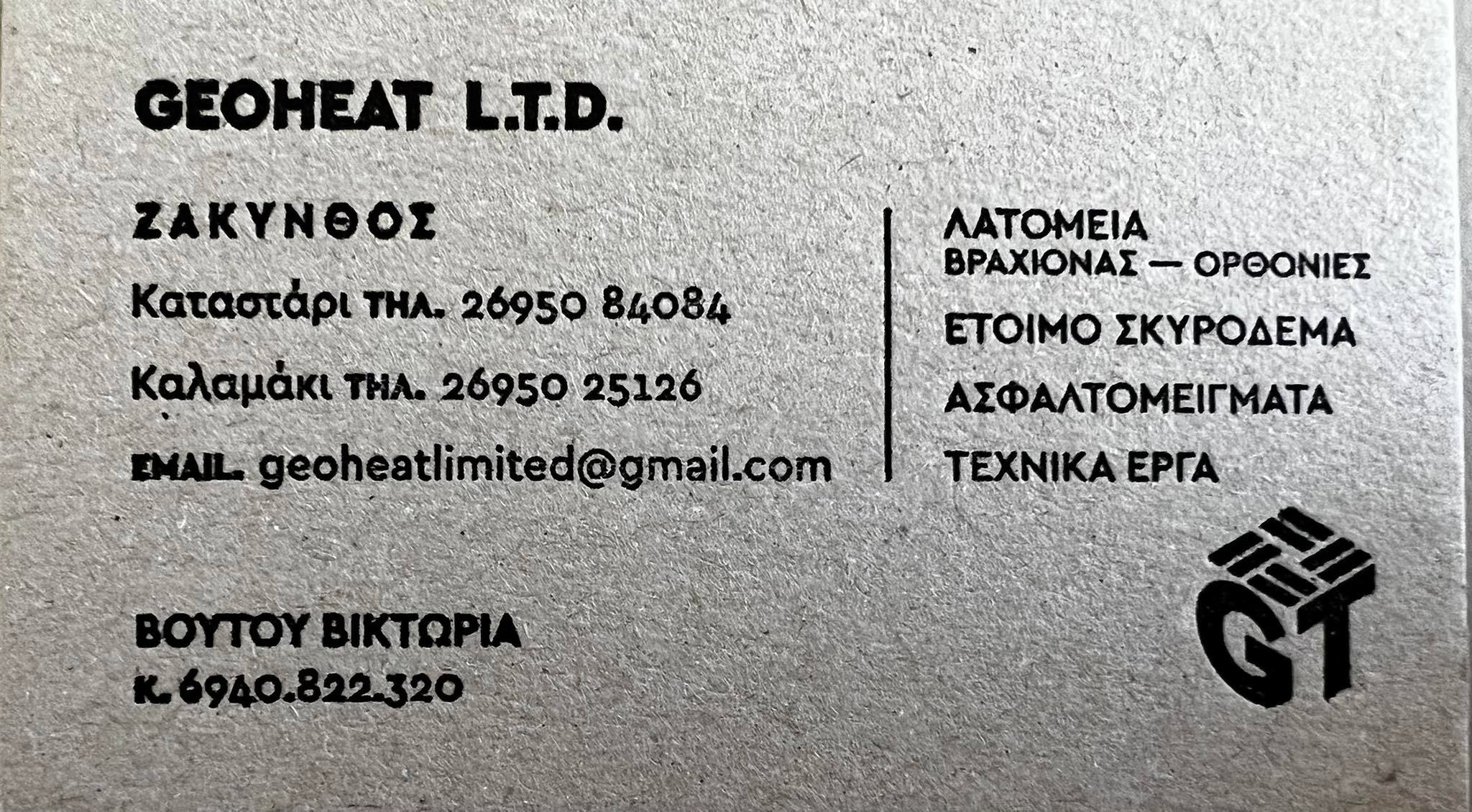 Η εταιρεία Κούλας – GEOHEAT LIMITED, με έδρα το Καλαμάκι Ζακύνθου, δραστηριοποιείται δυναμικά στον τομέα των δομικών υλικών και των τεχνικών έργων, προσφέροντας ολοκληρωμένες λύσεις για ιδιωτικά και δημόσια έργα σε όλο το νησί. Με σύγχρονες εγκαταστάσεις και εξειδικευμένο εξοπλισμό, καλύπτει ένα ευρύ φάσμα αναγκών που σχετίζονται με την παραγωγή, επεξεργασία και διάθεση υλικών υψηλής ποιότητας, συμβάλλοντας ουσιαστικά στην ανάπτυξη των κατασκευών στη Ζάκυνθο.